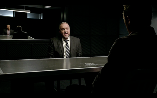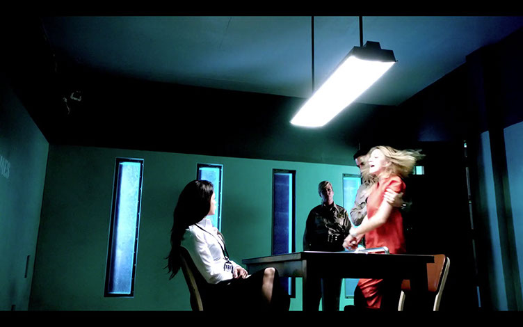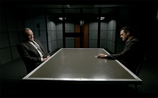 The interrogation room is a difficult set to design because of bare walls, limited lighting, an observation room and allowing for crew access.
