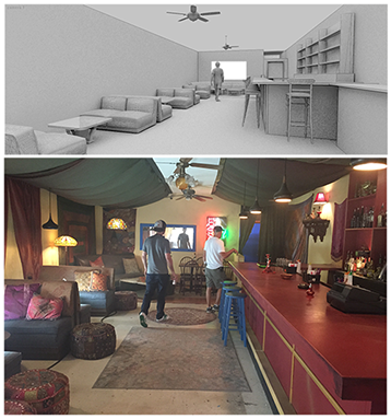 The image on the top right is the photoshop pre-vis we used to show out plan for the gym and the top left and bottom middle were the final product.