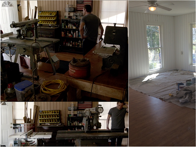 In the back story of this show the father of our lead owned a construction company. When it was time to shoot a scene in the fathers house we took this empty room and created a wood shop to support the characters back story.