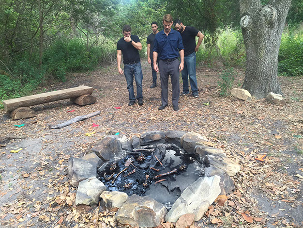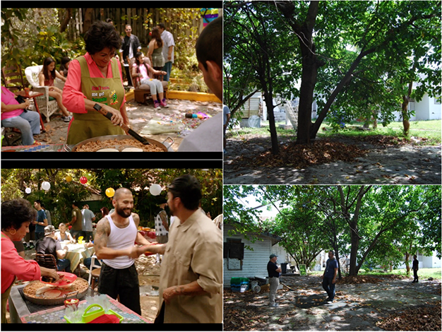 This scene was a festive celebration turned wrong. The fire pit was created by the Construction Department. SFX brought ceramic gas lit logs and Set Dec placed layering of string lights to help give depth to this night scene.